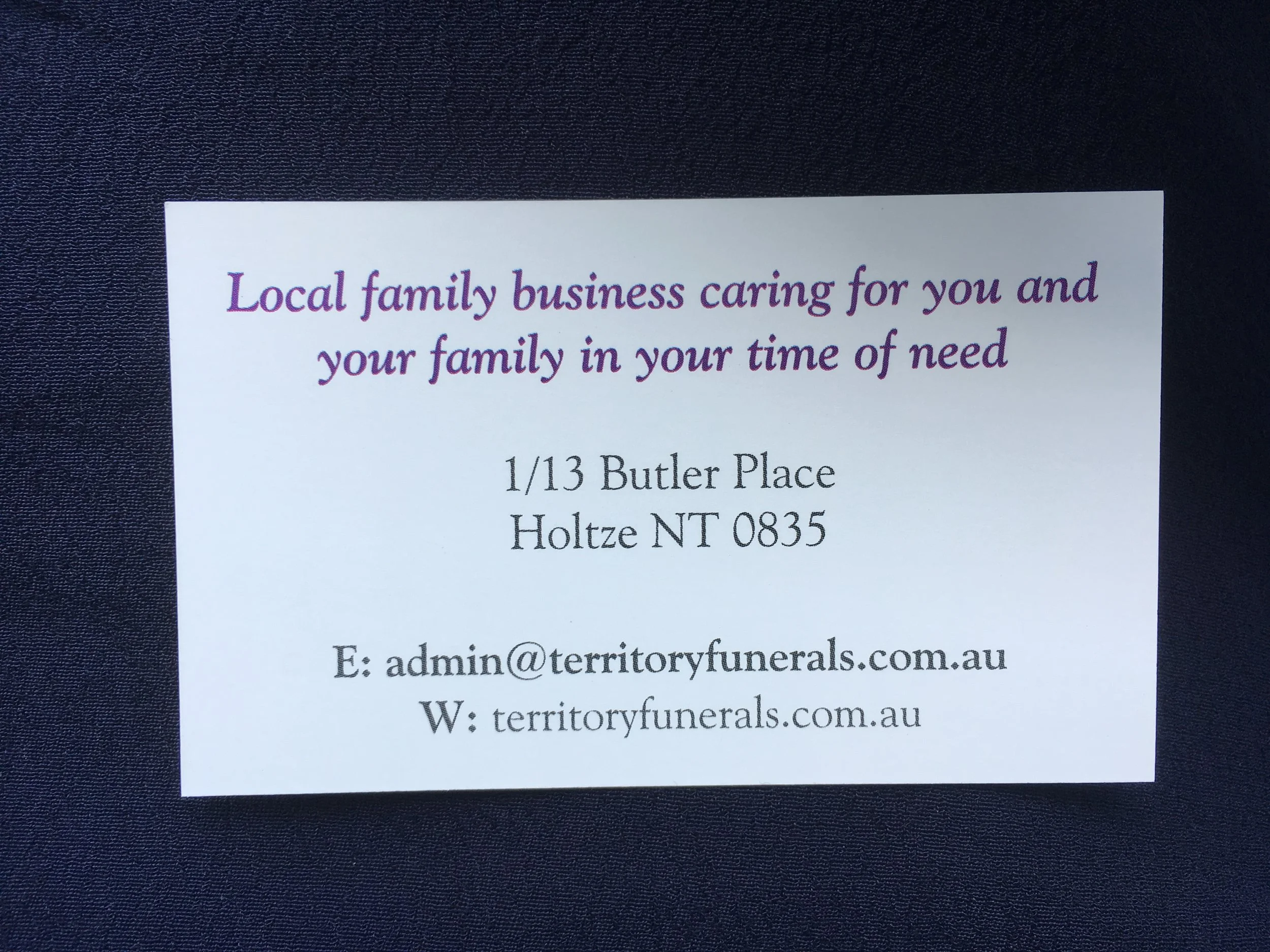 I was dropping off some paperwork at Thorak Cemetery last week and I noticed some new business cards on display in the office. Territory Funerals. A new local business, offering extremely customised funeral services without the high NT price tag. I rang the number straight away and arranged to drop in and meet Robert at their newly opened office.